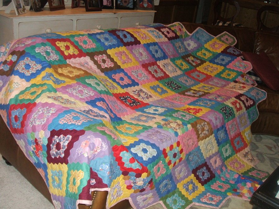 jvkorte Flower Garden - The top was made in the 1930's by Grandmother Joan McKinney Korte in Tulsa, OK. After I found it in a box in a closet after her death at 95 I finished it with a soft pink backing and hand quilted. A true family treasure.