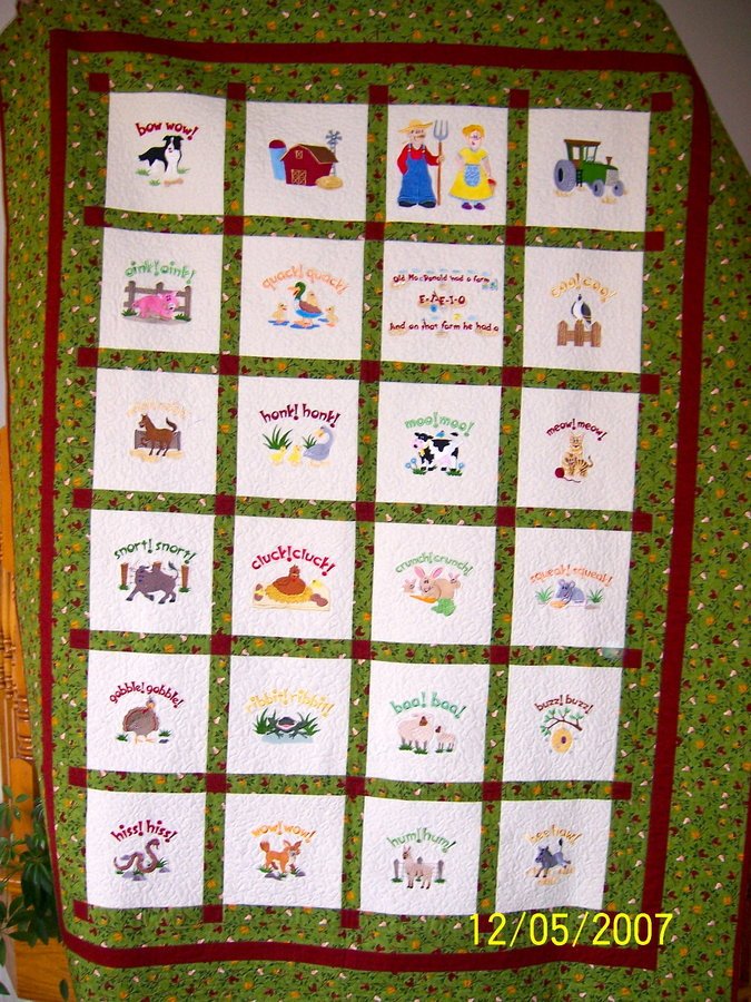 Supergrandma Old MacDonalds Farm - This quilt was made for my grandson. The blocks are machine embroidered with Old MacDonald Farm designs and the quilt design just adapted itself as the quilt was assembled. He dearly loves this quilt. It washes beautifully too.