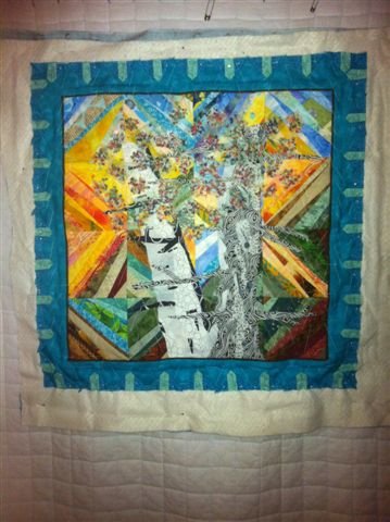 EllenG Sun Spot - One of my favorite memories of growing up in the Midwest was a crisp morning as the sun rose over the trees. The only sound may be a few birds singing or a bit of wind. Quilt is not finished yet.