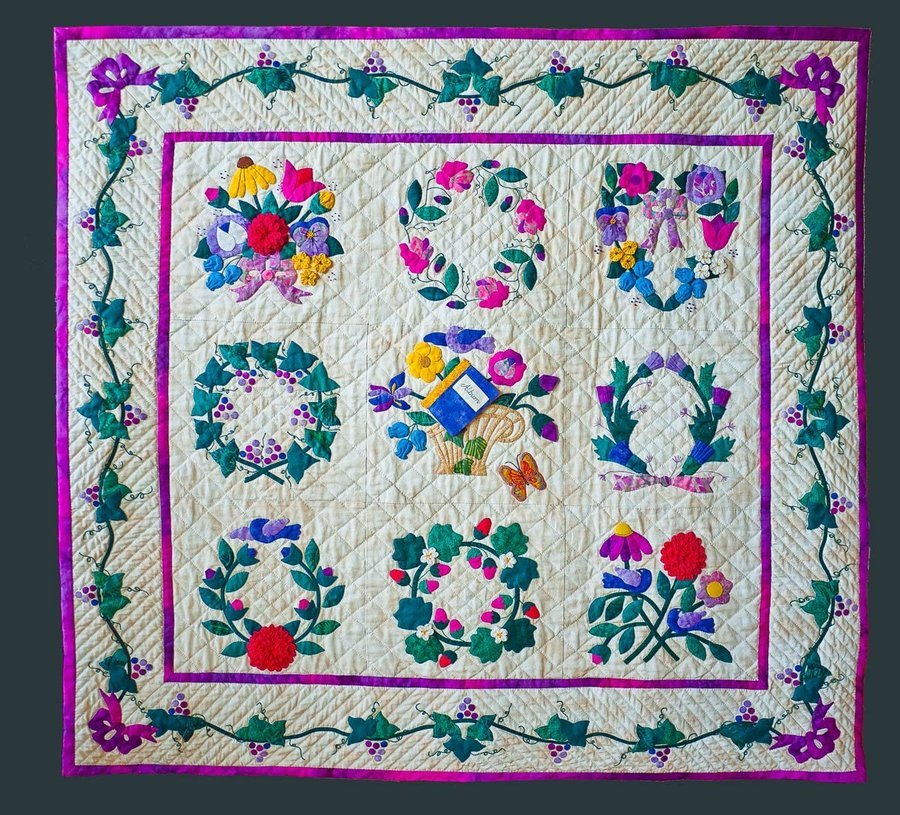 LizzE Baltimore Bouquets - This quilt is completely hand made, with needle turn applique, 3-D applique, embroidery, handpiecing and hand quilting. Most of the work was completed between 2000 and 2001 at which point it was packed up and stored until last year, when I pulled it from its wrappings and finished the quilting and binding.