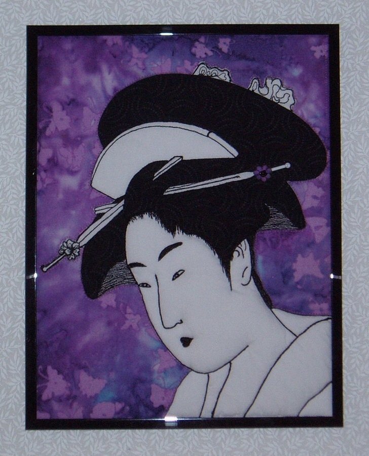 Scoopie The Geisha - This was started in a class by Faye Anderson at Houston Festival one year, and completed in 2011. It is mostly thread painted and freemotion outlined. The background is actually placed on top of, and around, the outline. It is heavily trapuntoed, for a more realistic effect.