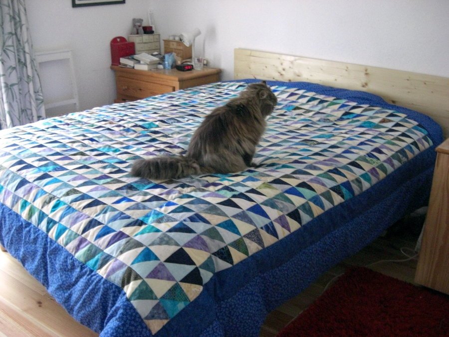 EIBHLIN THE LEARNING CURVE - I MADE THIS FROM SCRAPS LEFT OVER FROM OLD (35 YEARS?) PROJECTS, CLOTHING AND BED LINENS. MY FIRST RECENT ATTEMPT TO DO SOME PATCHWORK. I CAN NO LONGER WORK BY HAND SO MUST GET USED TO ALL MACHINE WORK.!