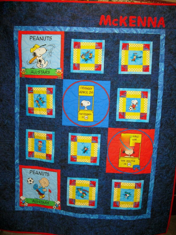 | Design Source - Description | This quilt was commissioned as a birthday gift for McKenna Heidt, age 10. She is a big fan of Peanuts. I made the quilt cartoon blocks using printed pillow panels. |