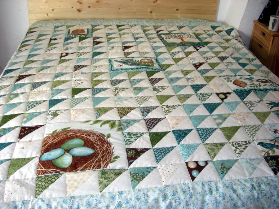 EIBHLIN THE BIRDS AND THE BEES - PLANNING TRIP TO AUSTRALIA TO VISIT FRIENDS... DECIDED TO TAKE THEM A QUILT. BOUGHT A FEW MODA CHARM PACKS AND A PANEL AND USED STASH FOR CONTRAST AND BORDER! QUICK QUILT BUT ONLY DID STITCH IN THE DITCH. UTILTIY QUILT BUT AGAIN LEARNED IN THE PROCESS.
