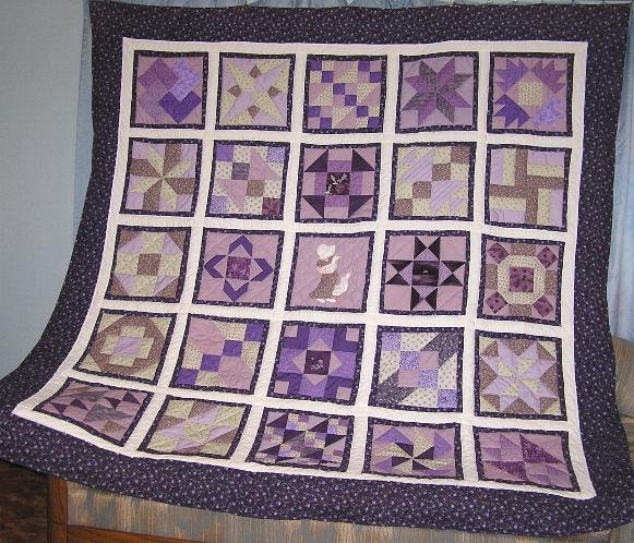 Bonisue Tami's Treat - Contains 24 pieced blocks and one appliqued SBS block and given to #1 granddaughter for her 25th birthday. She loves purple and I collected these fabrics over a period of 30 years before making her the quilt. She has used it as a bedspread for several years. The "Goose Girl" block was a pattern in a Quilt World magazine back in the 1980's.