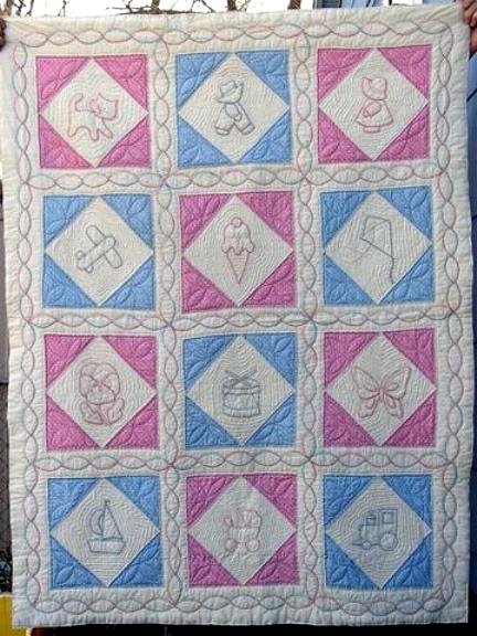 Bonisue Childhood Memories - Began this quilt in the late 1970's when candlewicking was popular, but didn't quilt it until 1984 to show at the NQA's Silver Jubilee in Charleston, WV in June 1984. The embroidered pictures are mostly my own designs except for "Farmer Jim" and "Patchwork Pat" who were designed by my friend, Pat Newkirk (deceased) in 1980. She designed them with my encouragement so I feel like a part-owner. I used the candlewicking for making the pictures and I wove pink and blue thru the chain in the stripping and the borders. Could not find cotton for the pink & blue prints so used a rayon fabric there. The white is cotton.