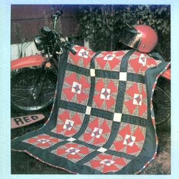 Bonisue Mike's Maltese Cross - This quilt was made of scraps from making polyester knit clothing plus two discarded pair of polyester slacks. When my son was a senior at Randolph-Macon Academy (VA) he had a private room with a damaged wall. He admired this quilt block design when he saw me using it in another quilt and called it a Maltese Cross. I then made him the quilt to cover his wall and he later took it to Randolph-Macon College where he used it as a utility quilt at concerts, parades, etc. to sit on and kept it in his car. When he suffered a fatal auto accident, bystanders took the quilt from the back seat and covered him with it. Years later my younger son had it in his car when someone broke in and stole it along with his CD's and hiking boots. We advertised in the local newspapers, but never saw it again. My younger son felt like he lost his brother all over again. This quilt was featured on the cover of "Quilt World Omnibook" for Fall 1981.