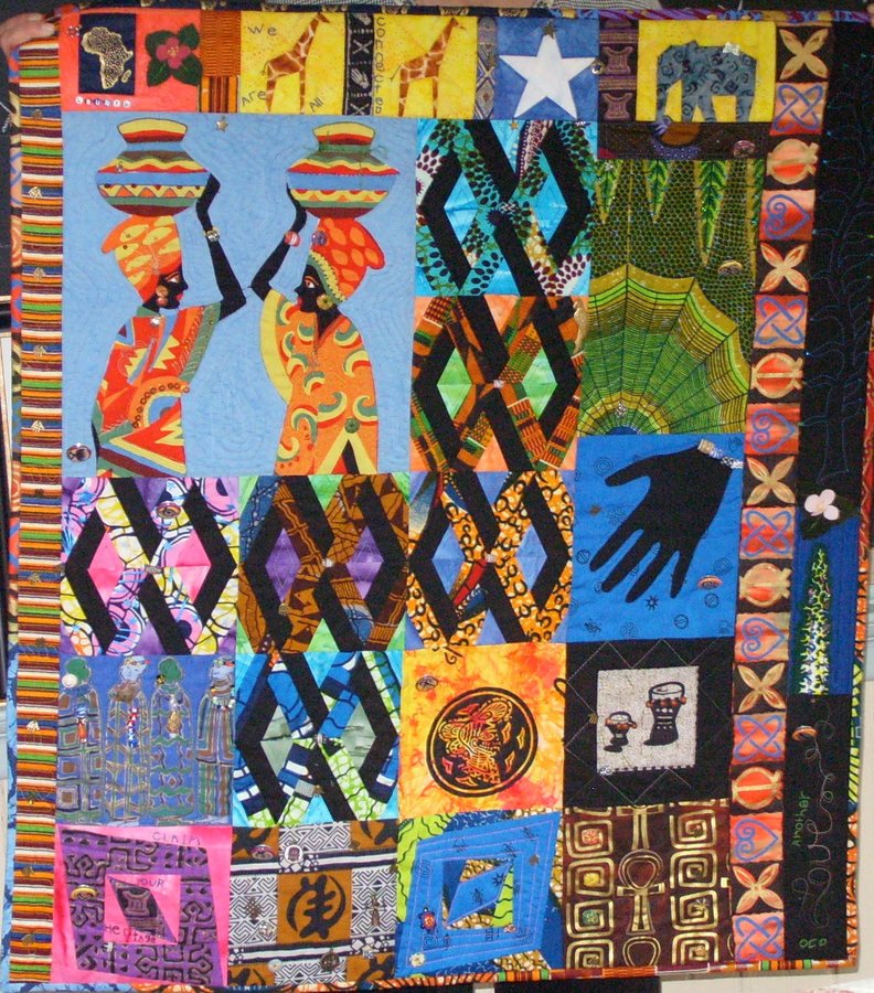 Wooda The same star shines on us all - I made this quilt for an event about the underground rail road in Kansas.... this quilt was to reflect African Heritage of those african americans who came to Kansas to be free during the 1850s. This quilt is full of fabrics and symbols. The story of the slaves following the north star to freedom is reflected in the name of the quilt..."the same star shines on us all"....