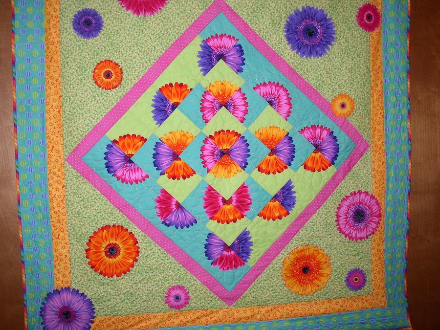 MAMA2TNT Flower Fusion - This quilt was made for my daughter when she went to college 2.5 hours away from home. Her dorm room was dull, drab, and depressing. This quilt was the perfect to brighten and cozy up her room and remind her that spring was only a few months away.