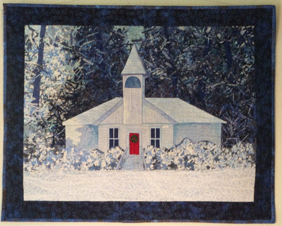| Design Source - Description | The Deer Harbor Community Building looked so peaceful bathed in the blue light of winter, that I wanted to quilt it. In the end though, it needed some color, so I gave it a red door. |
