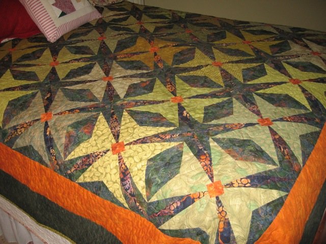 Welshwoman Templar - I had a number of beautiful lime green fabrics that I longed to use, along with a length of batik that I decided not to use for a Turkish coat I made.... That was the basis for the color scheme. I made one block at a time in the paper piecing method. I began with a design that I had seen by Carol Doak, modified and added lines until I was satisfied.