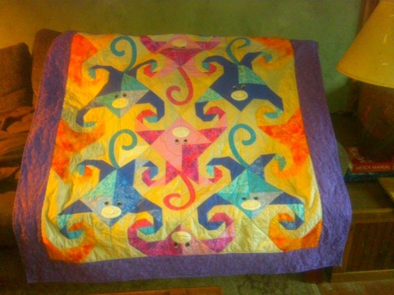 SpiritsFold Monkey Business - I adapted the published pattern to make a cuddle quilt for my granddaughter rather than a twin size quilt. In the process, I also changed the border.