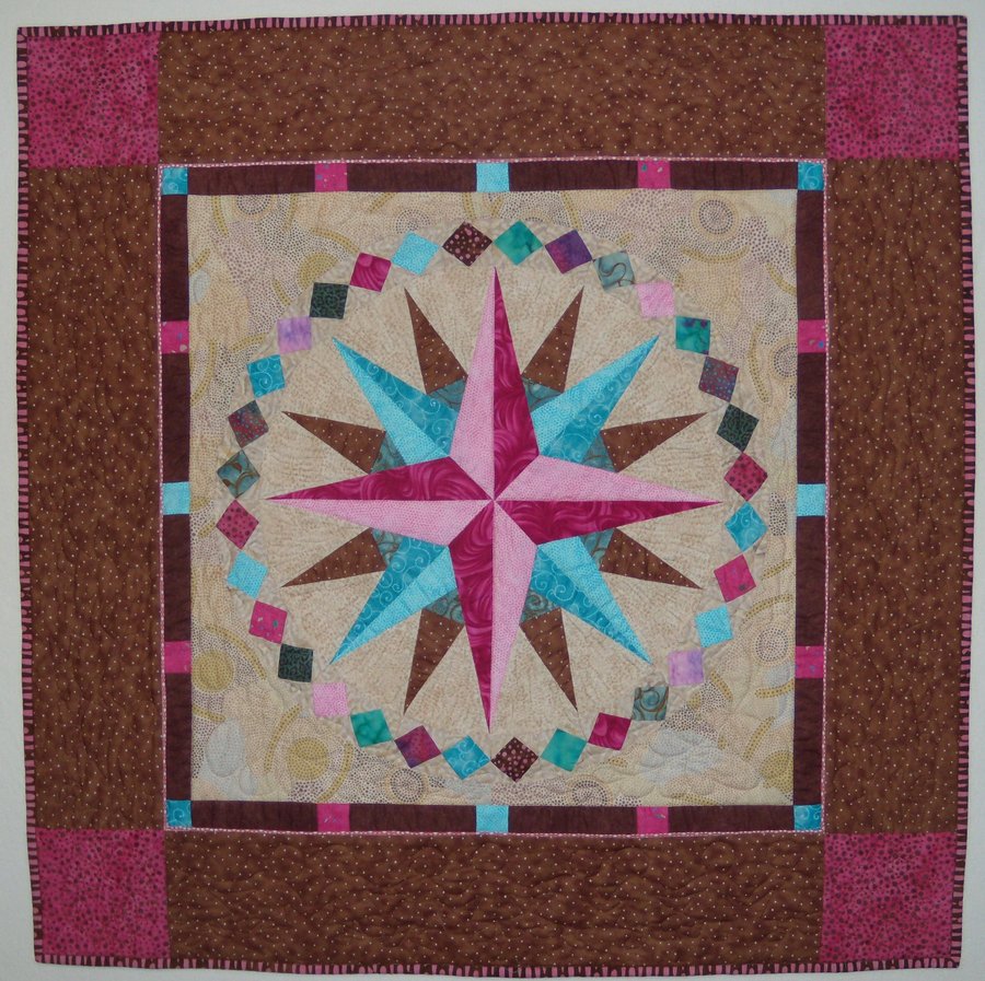 sghsgh New Directions with Noa - Quilt made to celebrate the new directions that a child brings and the many friends and family needed to bring up a child. Back has swooping free form flying geese. Free motion quilting includes paper-doll motifs holding hands in the border. This quilt was accepted and shown in the NQA 2012 Columbus Quilt Show special exhibit on Mariner Compasses.