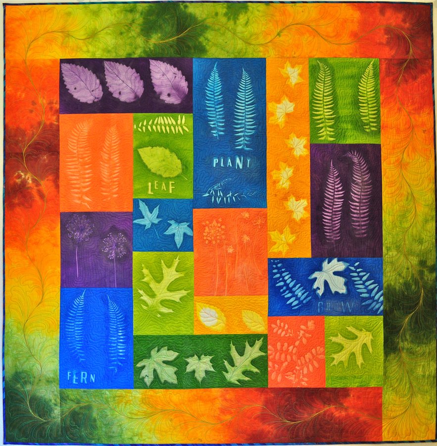 Annylu Nature Walk - 100% White Cotton Sateen painted with Setacolor Textile Paints then sun printed with botanicals. Go to this site to watch me create this quilt: http://luannkessi.blogspot.com/2011/12/challenge-quiltslideshow.html