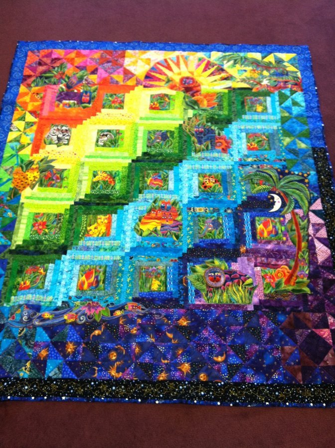 resapickel Sweet Dreams, Austin - This quilt was a "learning" quilt for me and represented my first attempt at both applique and free motion quilting. This started out as a baby quilt, but like all my projects, benefited greatly by "scope creep." If I had stopped with the log cabin blocks as I originally intended, the outer borders, the appliques, and the free motion quilting would have all been missing. I wanted to produce a colorful and interesting quilt that my grandson would enjoy throughout his childhood. I love scrappy quilts made with lots of fabrics. Austin discovered an added bonus, which I didn't even know about: the stars on the blue border, which is also the backing, glow in the dark!