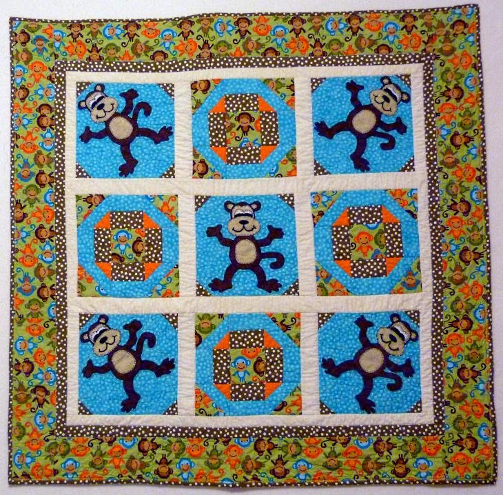 Groucho Tumbling Monkeys - My first applique quilt, made for the grandson of a co-worker. The bright and cheerful colors seem to delight the baby --- hooray. The pattern was designed by the talented Heidi Pridemore.