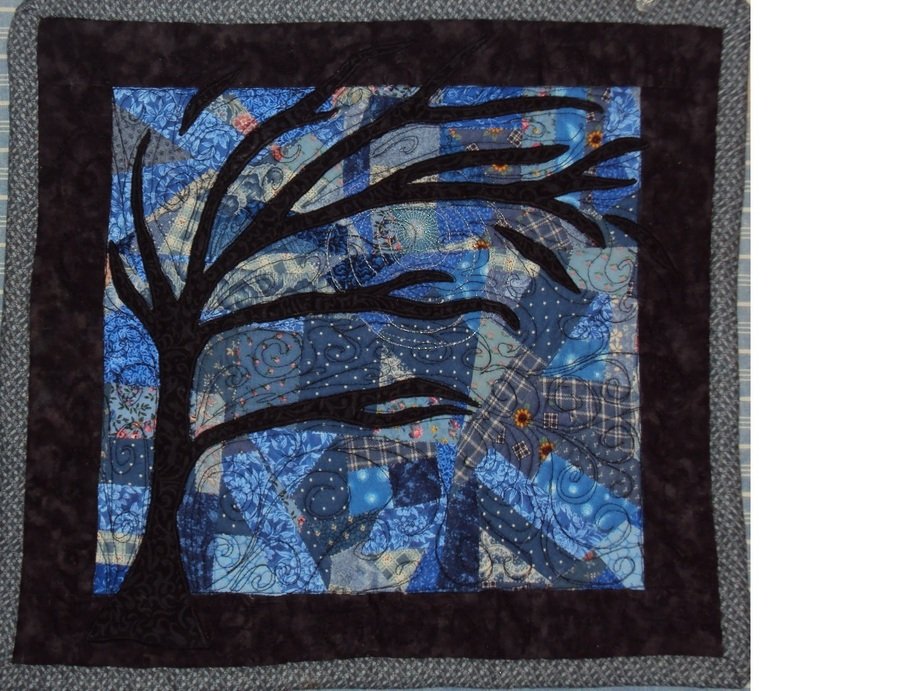 " A picture of a cold windy winter's night under a misty moon". Pieced in an assortment of blues, blacks, and greys in a random piecing style. Free motion quilted to show the wind swirling around the tree. |