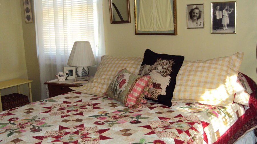 mostlydebbies Posey Patch - My mom gave me this pattern. She made it for my sister Terry as it was designed, as a table quilt. It was so beautiful that I had to make it and I added to it and made it a queen size. I loved it so much that I replicated it as much as I could. I love it in my spare room. It is done with the fused applique method with satin stiching around the edges, and pieced, then densly quilted in free motion.