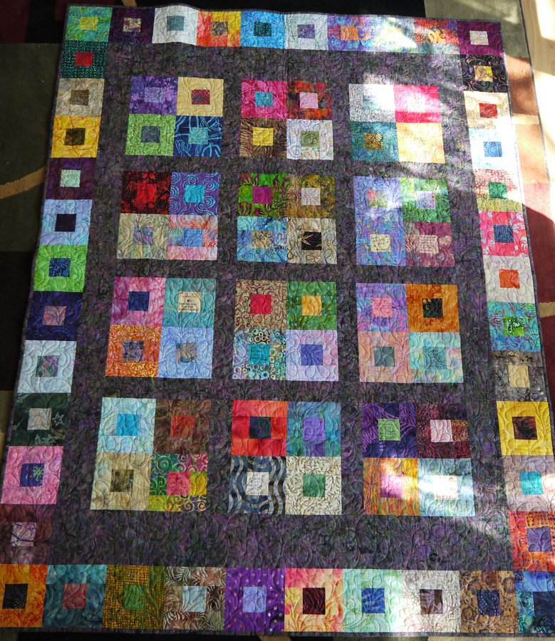 Lauraquilt Wedding Wishes - Cobblestone blocks in batiks exchanged at my local guild, well wishes for a wedding gift written on blocks by co-workers at my office for another co-worker's marriage.