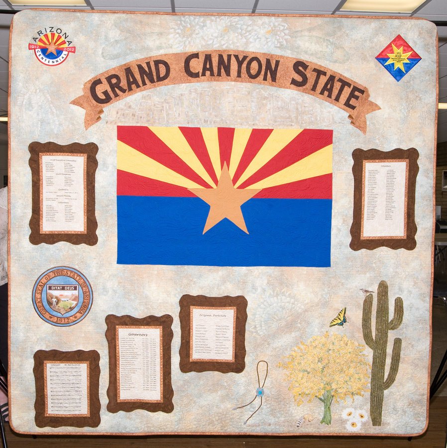 | Design Source - Description | To celebrate Arizona's Centennial, over 100 designers and quilters contributed to create this two sided quilt. It will be at the Russell Senate Bldg in Washington DC, March 26-30. |