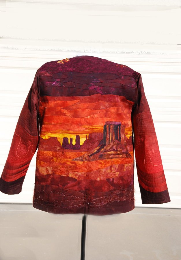 | Design Source - Description | Monument Valley photos and hand dyed fabric are the inspiration for "Desert Sunset". The beauty of the Arizona desert at dusk is captured with fabric, yarns, beads and textural elements |