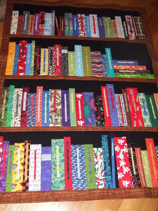 amonserud Mary's Retirement - When Mary retired from her long-time position as a school librarian, I made this quilt in her honor. Many of her colleagues contributed memories (in the form of book titles) along with their name (as book author) and some even contributed fabric for their book spines. Two other friends and I added the "titles" and "authors" to strips of colorful iron-on tape using permanent inks. The quilt commemorates her outstanding career as a media specialist in the schools.