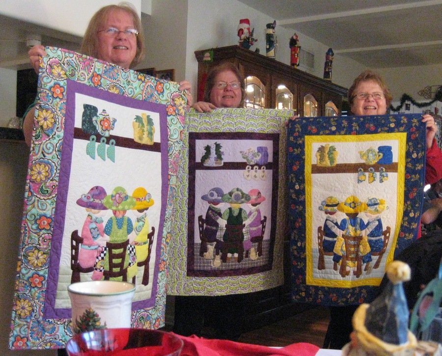 BonnieB2 We Three Sisters - A fun applique pattern that I first saw on Pam Dransfeldt's Joyful Quilter facebook page. Since there are three of us sisters, we decided to make one for each of us. We used different colors in each of the three quilts and then gave one to our non-quilting sister (pictured on the far right) as a birthday gift last December. It was a lot of fun. My sister, Leslie (pictured in the middle), and I pretty much made these at a Brown Bag Retreat at my LQS - The Creation Station, last July.