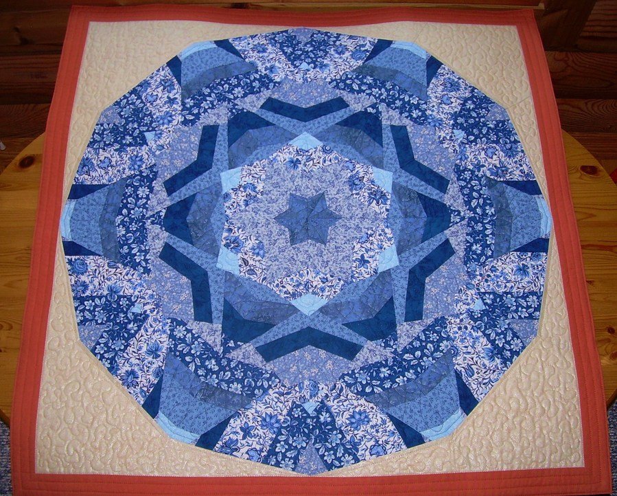 mimuscraft Särkynyt suunnitelma (Plans gone wrong) - Third time on kaleidoscopes. This one I made after watching episode 403. I should have arranged fabrics a little bit differently. Now it looks to me like some blue-white dishes have been smashed to the floor. Name does not refer to plans gone wrong on this quilt, "särkynyt" means "broken". Maybe there will be kaleidoscope quilt number four, so I will get all perfect. (I should by the book...)