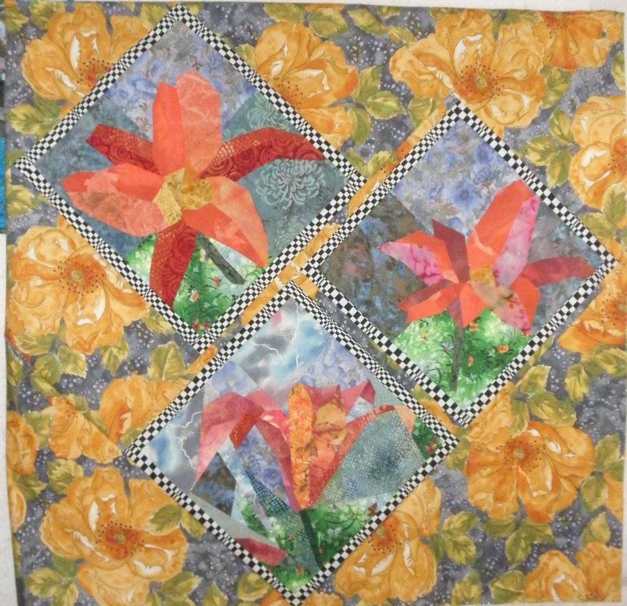 Bonniec UFO - The original Lily block was made in a class with Ruth McDowell in 2000 and it sat as an orphan block until this year when I was determined to include it in a quilt. I made two more blocks, but I cheated, sorry Ruth, and appliqued them. Then it was time to figure out a composition.