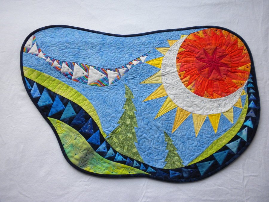 Katiezquiltz On The Way To Sun ~ Snow Geese Meet Rainbow - Gail Garber taught a class at MQXWest in Oct 2011 and taught the Goose Is Loose. In the class I designed my quilt and then pieced that design using the techniques I learned in class. I had a blast with the triangles and the circle I decided to do for the sun. A little challenging which pushed me into getting it done.