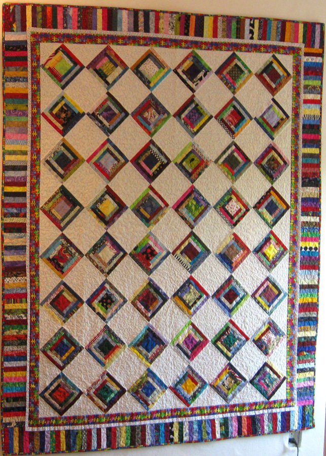 quiltgrammy Thinking of Nick - This is a 5-inch paper-pieced lob cabin block, a scrappy quilt. It is called "Thinking of Nick" because I used the Autism fund-raising fabric (the one that is jig saw puzzle pieces) in the first inside border. It is also on the back of the quilt. I quilted it using stippling in various sizes, as it resembles puzzle pieces. My grandson Nick is a victim of Autism. I continued the scrappy theme in the piano key border.