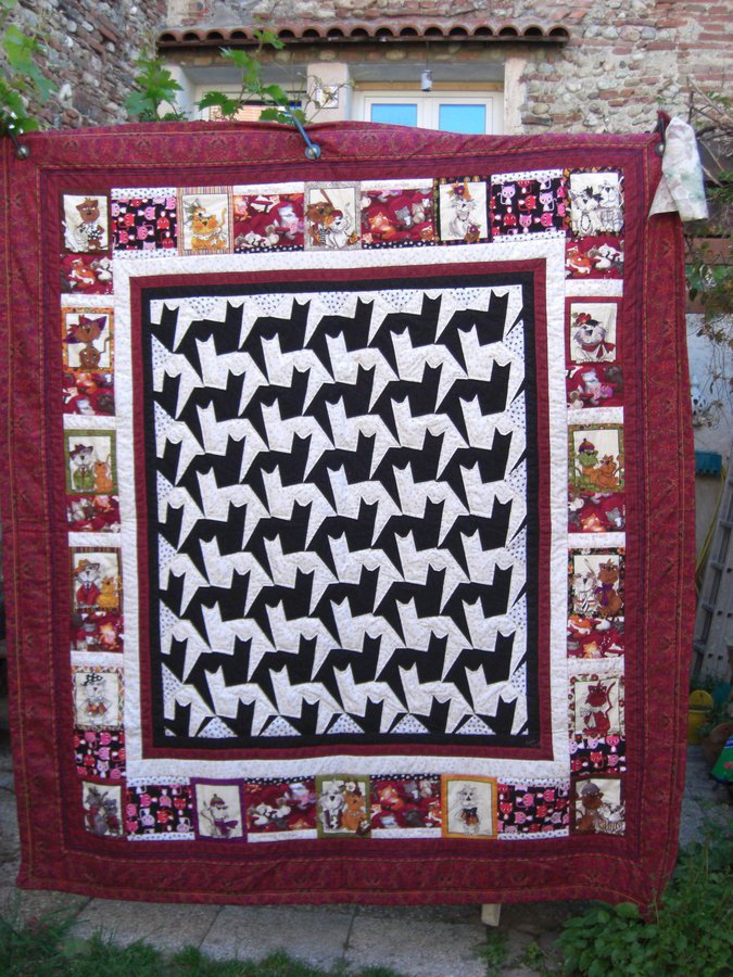 EIBHLIN Tessellating Tabbies and Friends - Loved the Tabbies pattern but took the easy option of using just black and white for the tessellations.I added the cartoon characters (a panel of 18 frames) and the Timeless treasures cats in the cinema to add humour. I have embroidered the names of all 12 family cats to add personal interest for Leanne, who had known most of them! The outer border and binding is a Jinny beyer border print.