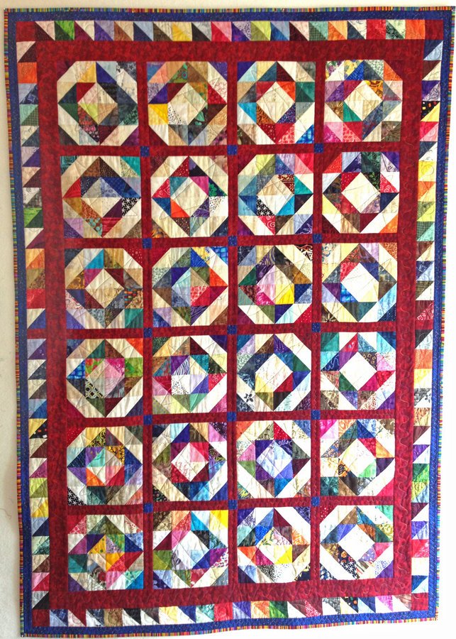 | Design Source - Description | This is the quilt I made from the Friendship HST Exchange. It is the Depression Block and has sashing and a saw tooth border. Quilted with decorative stitches with walking foot. |