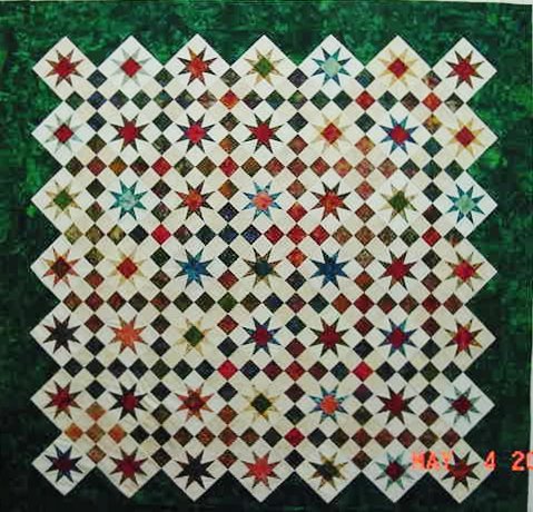 Chopin Floating Stars - This quilt was made with a Bali Pops and a special Creative Grid Ruler for the Stars. It was a challenge, but all points are perfect and the quilt is Squared. A lot of preparation time was spent in making this quilt but it was well worth it. To perfect the quilt, the Quilter's machine must be set for a true "scant" not a quarter inch seam, and if bali pops are used (batiks) remember that they are hand cut and some of the 2 1/2" strips are not accurate. I am very proud of the outcome.