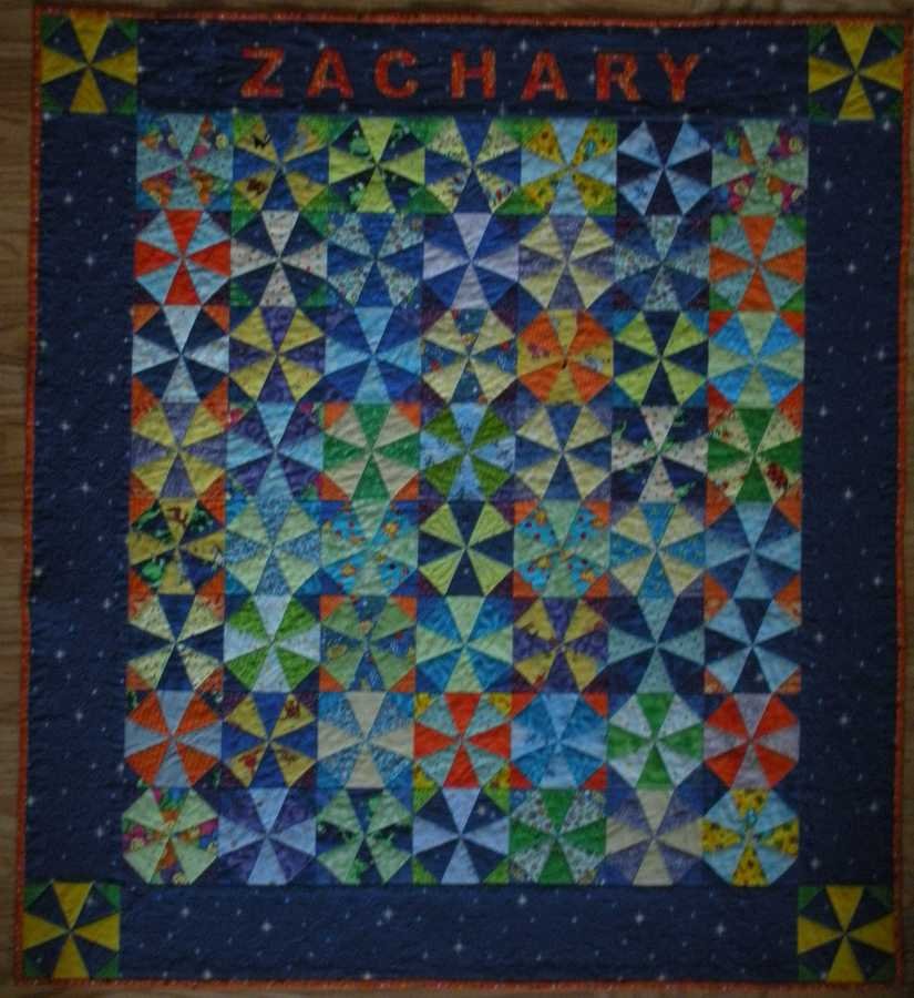 Marna Z's Kaleidescope - Quilt measures 45 x 50. Some blocks have child pattern fabric for fun and "I Spy" experiences.