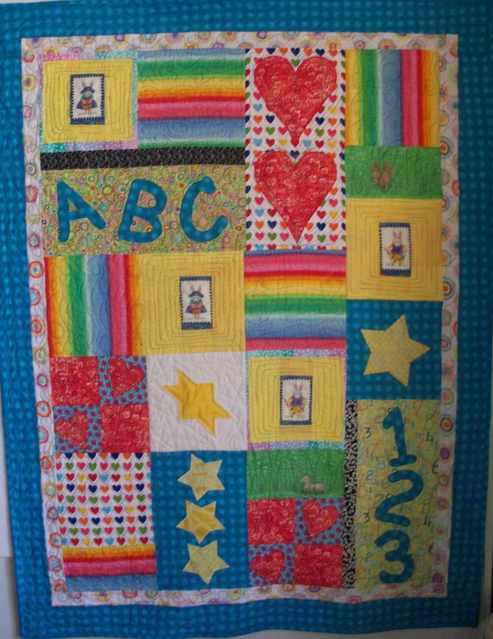 | Design Source - Description | Intent on reining in my overflowing stash, I incorporated the "Bunnie Blocks" front and back; rainbow fabric plus several others, all from previously purchased fabrics and orphan blocks. |