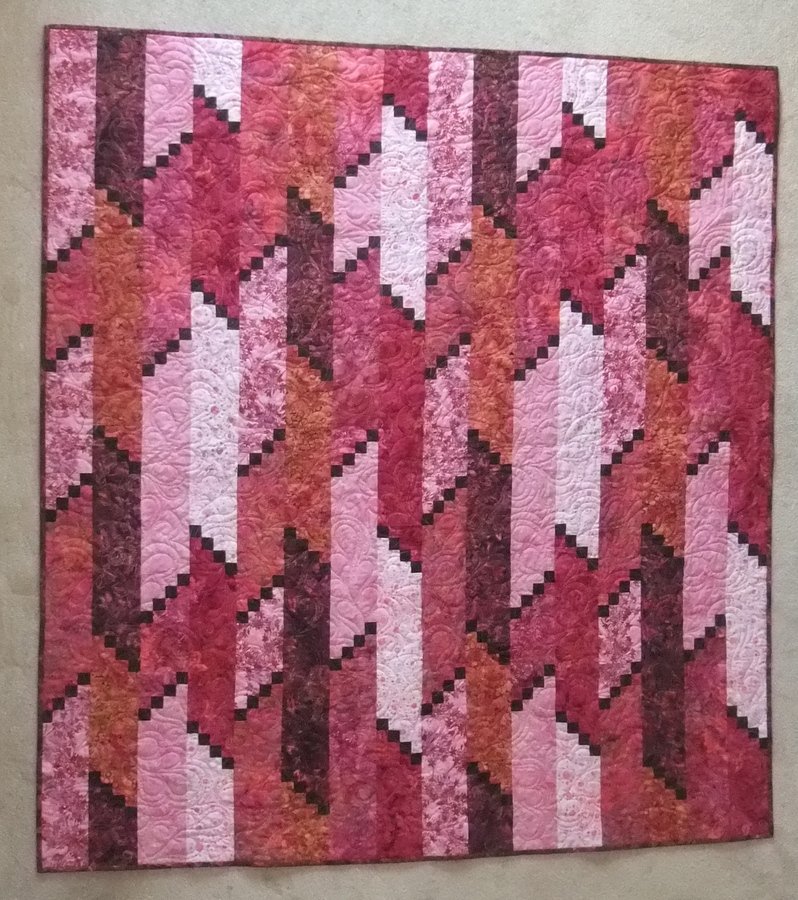 sewcolorful Fire Escape - I loved this pattern but felt the strips were too wide so I cut everything down by 1/3. I used the queen size pattern so I could use more fabrics and ended up with a nice lap size. I made 8 in. blocks of the rest of the fabric (I always buy extra) and put them together for the backing. It's my favorite quilt so far this year.