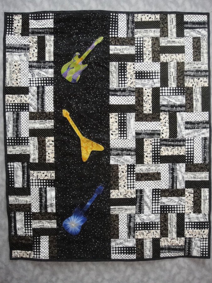 MCapps1999 Rock On - A baby quilt for my husband's friends on the event of their first child (Jet Michael). The dad is the lead guitarist in the rock band Crimson Glory. All black & white prints (mostly musical notes themed) with three applique guitars and backed with black fabric with multiple types of guitars.