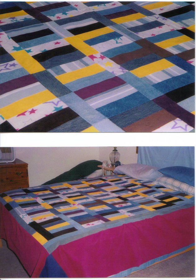 | Design Source - Description | blocks of old jeans, knit clothing, plus extra fabric for borders |