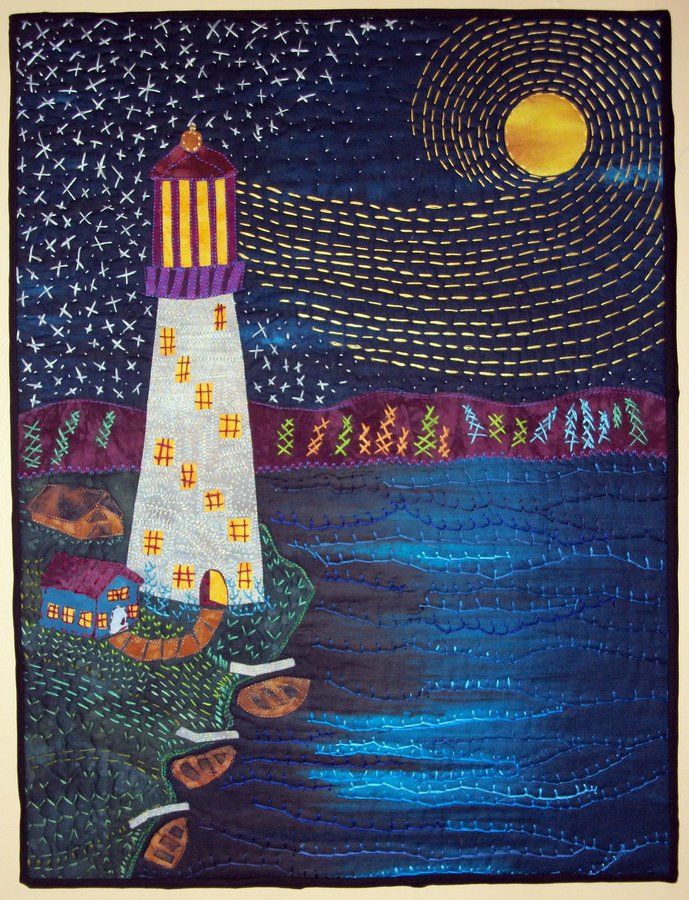 | Design Source - Description | Inspired by Laura Wasilowski's Lighthouse. My first attempt at hand-quilting to add texture to my quilt top. Stretched on a frame. |