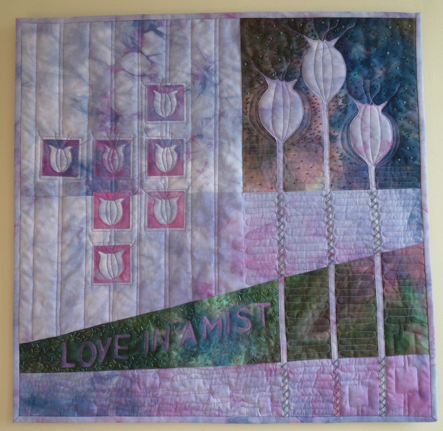 margaret5368 Nigella - Hand dyed fabric. Pieced background. Raw edge applique with hand embroidery and beads. FMQ. Final part of my City and Guilds.