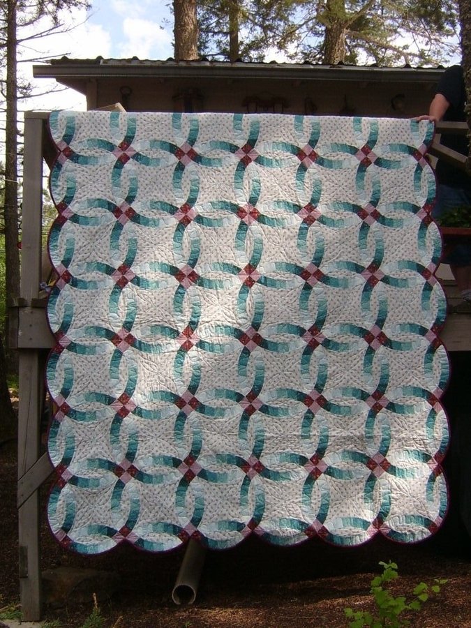 FCorina Wedding Quilt for Carlos and Katie - I made this quilt when I was still living in AK. Then my baby brother was getting ready for his wedding with Katie so it was just on time to offer as a wedding gift to them. To complete the work I rented a long arm sewing machine in a local quilt store to do the stitch all by myself. It was a hard work but it looked great.They live in Sydney Australia.