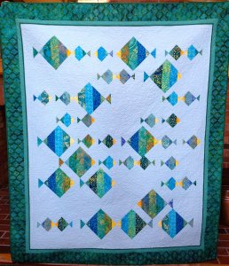 rittmeyer "Jelly Fish" for Wesley - I used a Timeless Treasure jelly roll that I found and just had to buy because the colors were so wonderful. I also really wanted to get the quilt done and thought having the strips already cut would make things go faster. Well, live and learn. After I eliminated two rows to re-size the quilt I then had to refigure the cutting directions, the piecing was more complicated than I had anticipated and then I added lots of free motion quilting so all in all it was not a fast quilt to make but lots of fun.