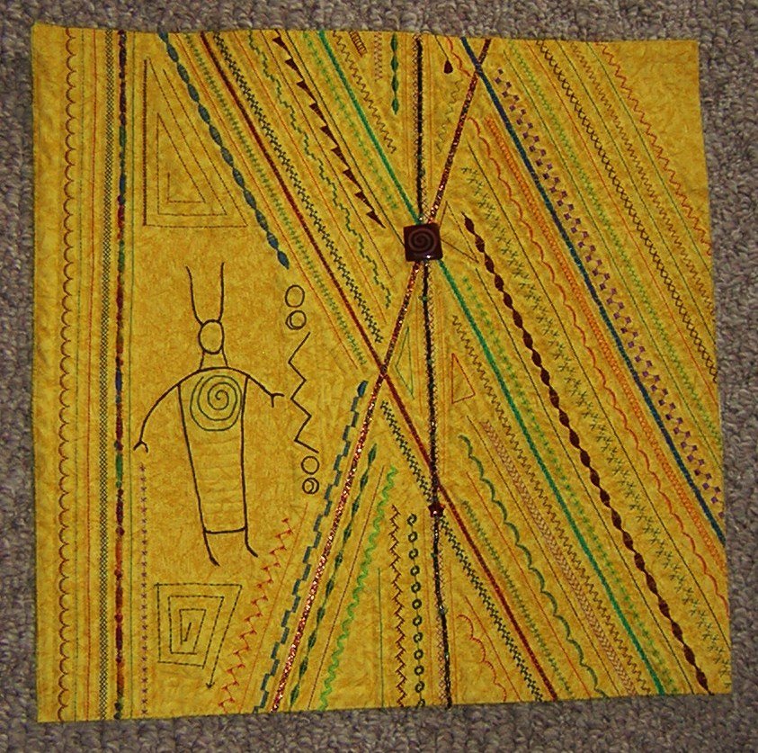 | Design Source - Description | This panel was started with the thread sketch of the Shaman, then yarns and ribbon couched; then stitched. The beaded strand was couched onto the surface after quilting. The square will be constructed into a sofa pillow. |