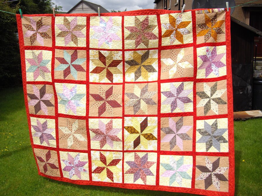 mc555 Imperfect LeMoyne - Watched Alex's class , made LeMoyne star blocks from scraps. Used quilt as you go method. The blocks were all different sizes!! sashing is all "skiwiff". It is certainly not perfect but fun to do and my four month great great niece loved the colours. I've had hand sewing all winter, used a lot of odd fabrics and I am trying not to be annoyed because its imperfect.