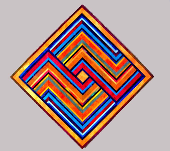 Jolet WonkyWorks46 - I simply started tearing strips of Ricky's fabric and sewed them together, not having any plan in mind. After cutting up the sections, a pattern emerged which excited me. The quilt is now hanging over my fireplace.