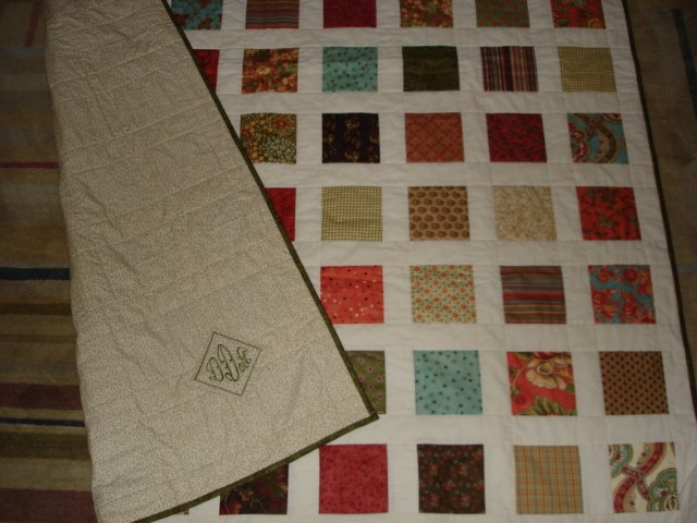 katherinequilts Lap Quilt - This is just simple squares with fabric we loved. My granddaughter Hannah arranged the fabrics, another granddaughter Madelyn picked the monogram design, and my daughter Holly kept the quilting squares in order and properly ironed. We made it a group project for a friend who is undergoing chemo