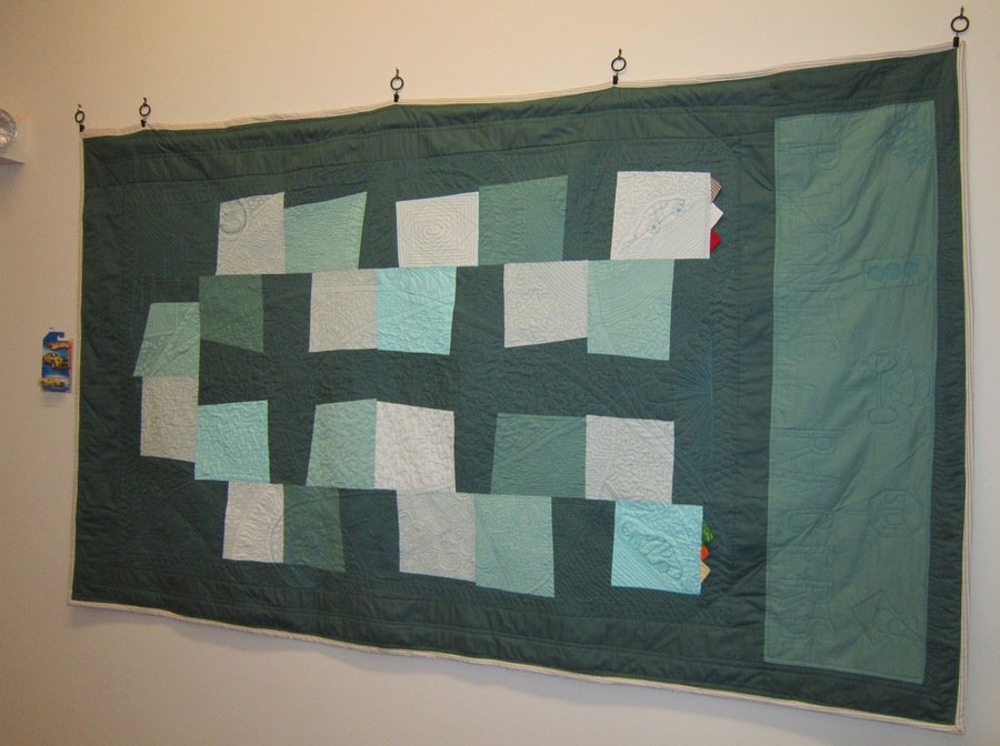 im4himfirst Picnic~Racers - My first "Modern" Quilt (a picnic blanket) when grandsons visit. The pattern placement of blocks allow 'the boys' to race cars from the start line (see flags bottom far right) over light colored wonky blocks, around corners, onto the finish line flags at the top right block. The Zen String throughout quilt top is echoed, creating a pathway wide enough for matchbox size cars to race a different course. If you look closely,to the far left of the quilt (on the wall) you will see a "Hot Wheels race car". On July 16 I took "Picnic~Racers" to the university, part of an art exhibit titled, "The Feel Good Gallery" open to the public through end September. There is still more quilting I would like to add, (especially around the pillow area) where I drew in thread a few images of cars, road signs and lettering once "Picnic ~ Racers" returns home this Fall. Hidden within some of the FMQ are a few written messages- I love writing within the quilting to be found later by those who study the quilting!