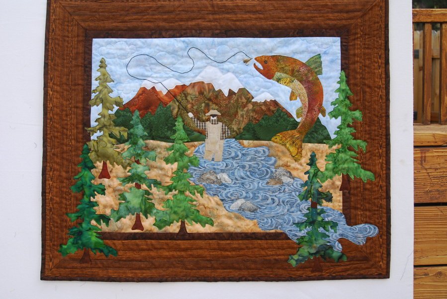 AnnieH I'd Rather Be Fishing - My husband needed a new cubicle quilt for his new job. He's an avid fly fisherman, and tied the fly that the trout is leaping toward.