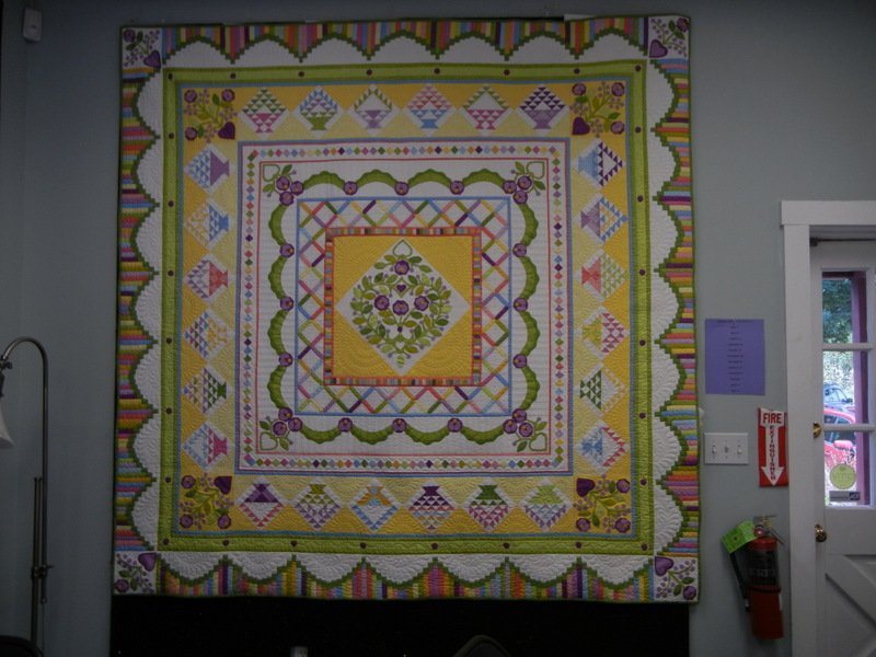JaneHarris Ruffled Roses - This pattern was offered as a block of the month by The Quilt Show. I bought the [pattern, I think in February of 2011 but did not get a start on it until August of that year. I finally finished it in March of 2012 just before my husband had a heart attack. It was the most challenging pattern I have attempted in my 17 years of quilting. The professional long arm quilter, Pam did a magnificent job on the quilting. It is true, "quilting makes the quilt" I will enter it in my guild show in October.